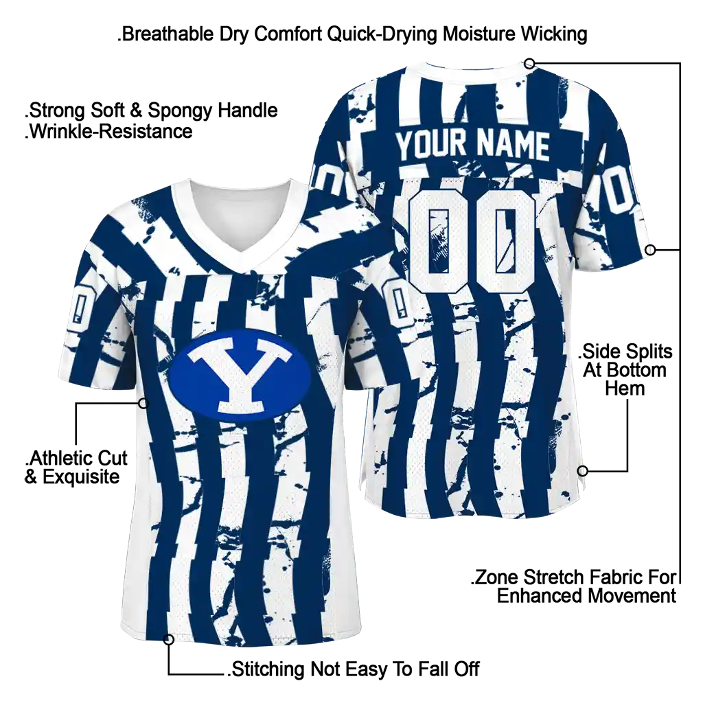 The BYU Cougars Jersey – Customized Stripe Splatter Blue delivers professional style and performance with the flexibility to make it uniquely yours. Engineered with breathable fabrics and moisture-wicking technology, it ensures you stay cool, dry, and comfortable—even in high-intensity games.